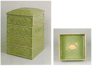 この作品は、型成形による大形の四段重で、窓絵状の構図を四面に配し、それぞれ牡丹文を浮き彫にしている。全体に深みのある青磁釉がかけられている。また内面中央部(写真右)に、側面とは異なるデザインの牡丹文が施されており、花弁部分を無釉にすることにより、緋色を引き出し、青磁釉と美しく調和している。