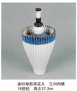 写真のような、三川内の細工技術を生かした傘の意匠は比較的多く知られるが、この作品では、傘を立ててやや開いた内側に花が活けられる状態に作られており、柄の部分で吊り下げる掛け花入れである。太く力強い骨の造形と口縁部を引き締める染付の帯が、繊細な中にも重厚さを漂わせた作品である。