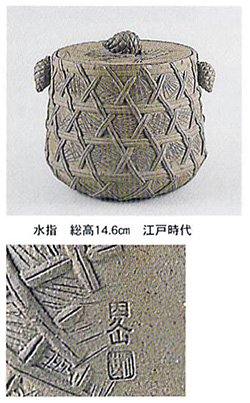 現在は、江戸時代から続く七室の連房式登窯を焼き継ぐ、芹澤家が窯元として知られる。 [作品解説] 松と竹がテーマとなっており、竹で編んだ籠に松葉が詰め込まれた状態が表現され、両耳と蓋の紐は硬くしまった松毬をかたどっている。底部には、「因久山」「勘」の印銘が認められる。 なお、「勘」印は、数種類知られているが、父子の作品の区分は明確ではない。