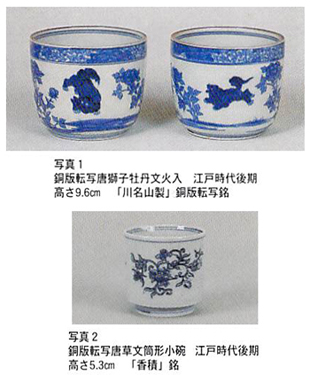 製品は、火入がよく知られているが、酒器や水屋甕などもあり、「川名山製」「安政年製」などの銅版転写による染付銘が伴う。窯は同町に所在する曹洞宗味岡山香積院に隣接してあったとされ、同院の什器(筒形小碗、写真2)も焼いている。中国風とは異なるエキゾチックな唐草文が銅版転写で染付され、高台内には「香積」の染付銘がある。