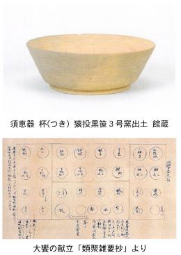 神饌に用いられる器はその時のみ使用されるもので、「土器(かわらけ)」と称される土師器であることは周知の通りです。大饗の記録では「飯」の隣の碗皿類4 枚が調味料(塩・酢・酒・醤)入れに使われ、その他も含め全ての食器が須恵器であろうと考えられています。このように同種の器を大量生産でき、酢などの調味料にも影響を受けないやきものは、食器に適した素材として受け入れられたと思われます。
