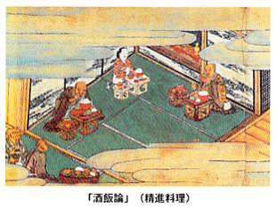 ちなみに、精進料理とは魚肉・肉食をしない禅宗寺院での料理ですが、「魚肉もどき」までも作る高度な調理法、あるいは豆腐・沢庵をはじめとする新しい食品の加工法など、日本料理への影響は計り知れないものがあります。一方で、本膳料理は魚鳥を用い、味付けはカツオ・コンブのだし・醤油・味噌・塩など、料理法は焼き物・煮物・汁物・あえ物などがあり、全体として手間をかけた料理で、配膳や飾り付けにも規範が伴う式正料理として完成されました。このように室町時代は、日本料理の代表的食材や調理法、伝統的な食事作法などがほぼ完成した時代でした。この後、日本料理の新たな展開が禅宗寺院と武家の食文化を融合させた場となったのは、必然的な流れでもありました。